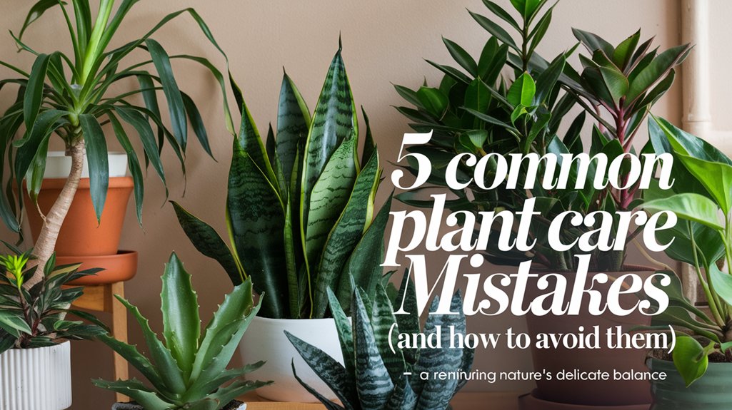 Avoid five common plant care mistakes to guarantee thriving houseplants. Don’t overwater, as it leads to root rot; check soil dryness before watering. Provide adequate light; otherwise, your plant may lean or grow slowly. Use the right soil mix and pots; ascertain they have drainage holes. Repot when roots show through holes and soil dries quickly. Watch for pest signs like curling leaves; early action is essential. By addressing these issues, you’ll learn how to keep your plants healthy.