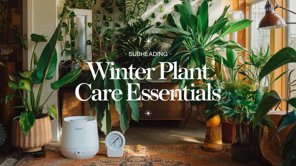 Maintaining perfect humidity levels is essential for the health of your indoor plants. Most thrive at 40-50% humidity, but winter’s indoor heating can reduce moisture levels. To increase humidity, consider clustering plants; their transpiration creates a humid microenvironment. A humidifier guarantees consistent moisture levels, unlike regular misting. Track conditions with a hygrometer to prevent low humidity, which causes leaf browning.