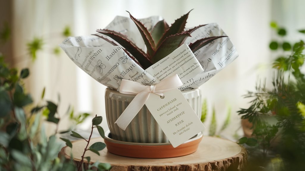 Complement the plant’s natural beauty with small embellishments like dried flowers or natural twine for a rustic charm. Incorporate decorative labels or tags with care instructions and a personalized message to make the gift thoughtful and engaging.